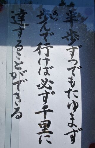 4月に入って、天龍山洞雲寺に詣でて墓参りをした。山門の掲示には「半歩ずつでも歩んでいけば、必ず千里に達する」とある。 その意味するところは、「千里の道も、半歩ずつでも積み重ねなければ、到達することはできない。」であり、「何事を成就するにも、…