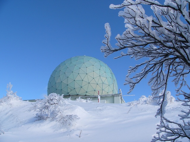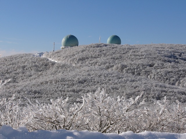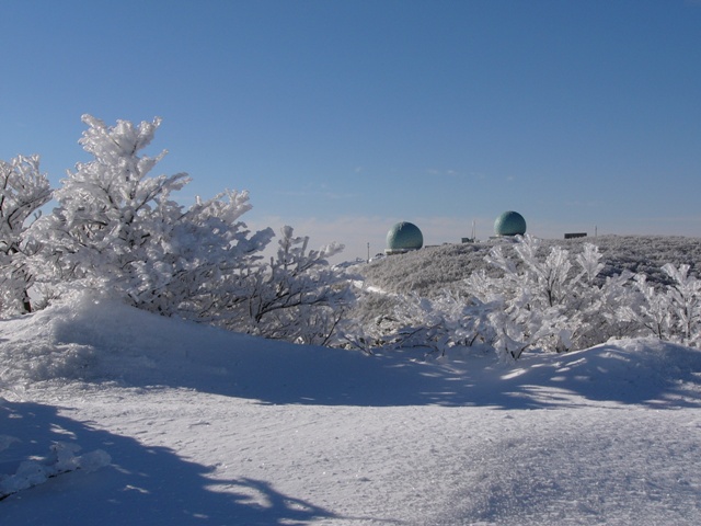 《 大滝根山は、標高1192mで 阿武隈山系の最高峰、かまぼこ隊舎地区からレーダー施設を眺める。かまぼこ隊舎であったが暖房がよくきき室内は快適であった。一歩外に出ると自然の厳しさがあった。》